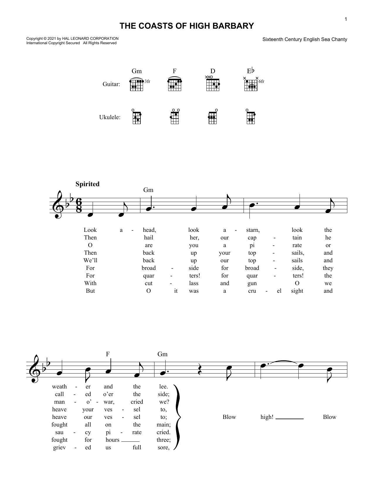 Download or print 16th Century Sea Chanty The Coasts Of High Barbary sheet music, chords and digital score arranged for Lead Sheet / Fake Book. This Folk score includes 2 page(s).