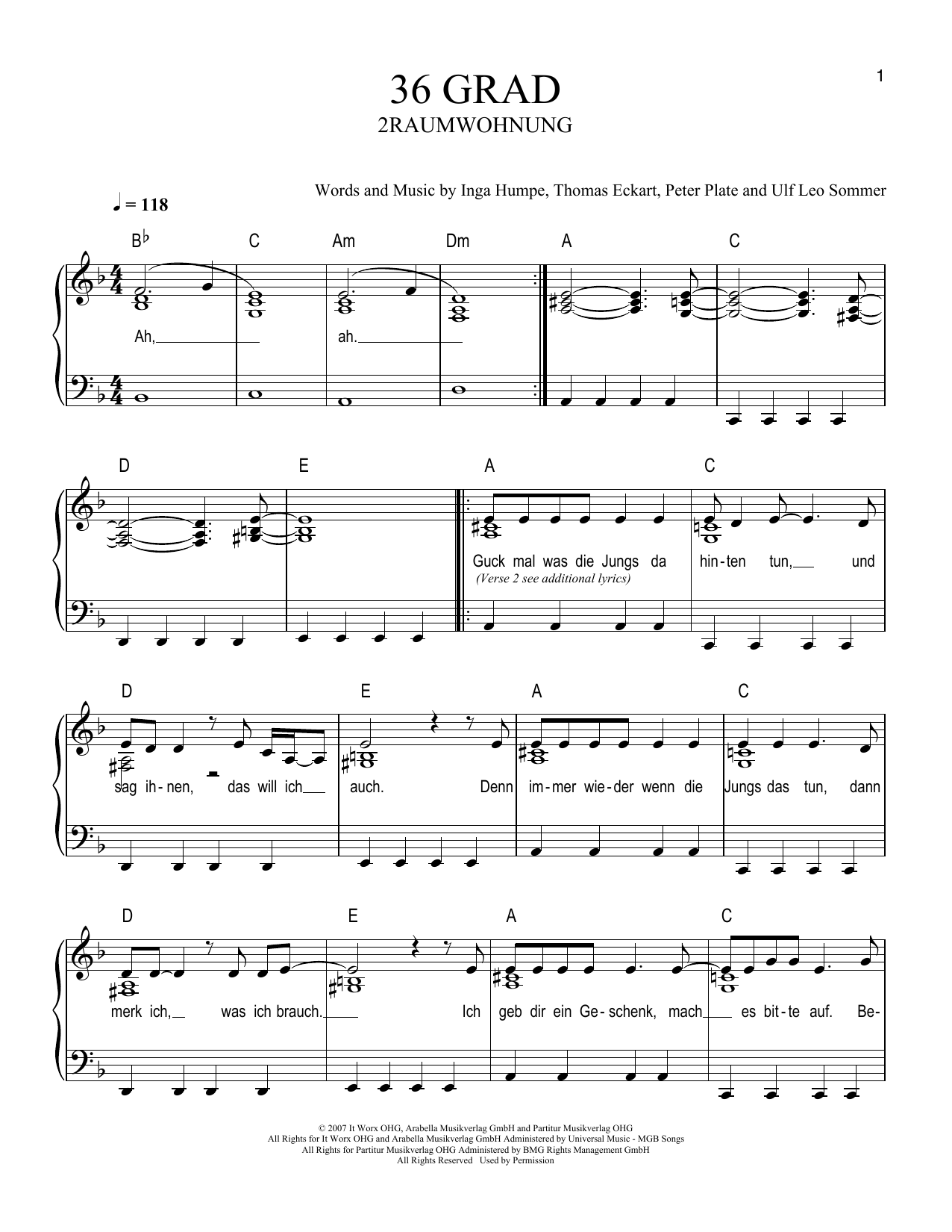 Download or print 2raumwohnung 36Grad sheet music, chords and digital score arranged for Easy Piano. This German score includes 5 page(s).