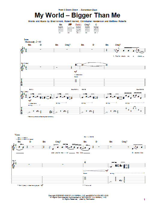Download or print 3 Doors Down My World - Bigger Than Me sheet music, chords and digital score arranged for Piano, Vocal & Guitar Chords (Right-Hand Melody). This Metal score includes 6 page(s).