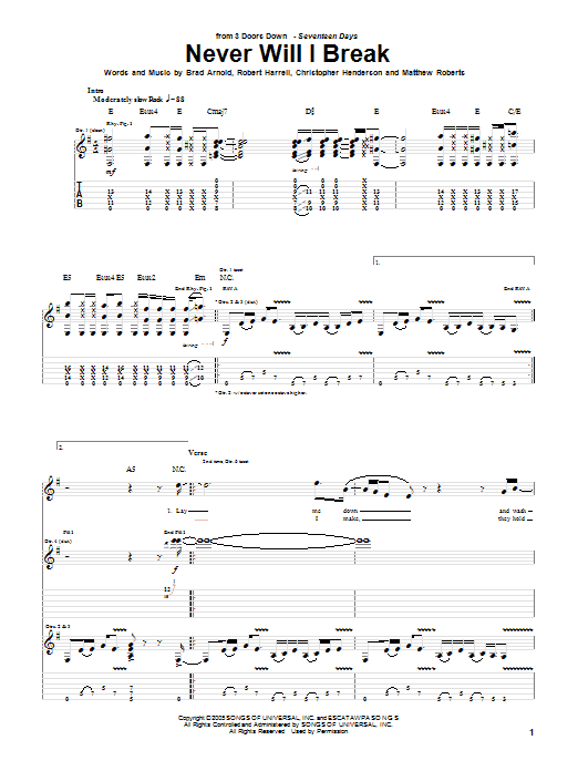 Download or print 3 Doors Down Never Will I Break sheet music, chords and digital score arranged for Guitar Tab. This Metal score includes 8 page(s).