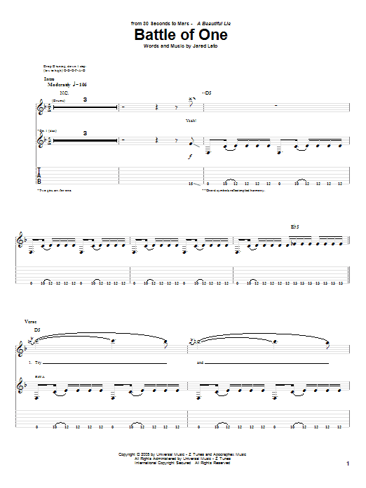 Download or print 30 Seconds To Mars Battle Of One sheet music, chords and digital score arranged for Guitar Tab. This Pop score includes 8 page(s).