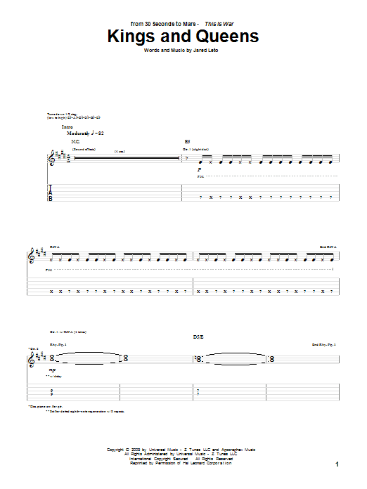 Download or print 30 Seconds To Mars Kings And Queens sheet music, chords and digital score arranged for Guitar Tab. This Pop score includes 11 page(s).