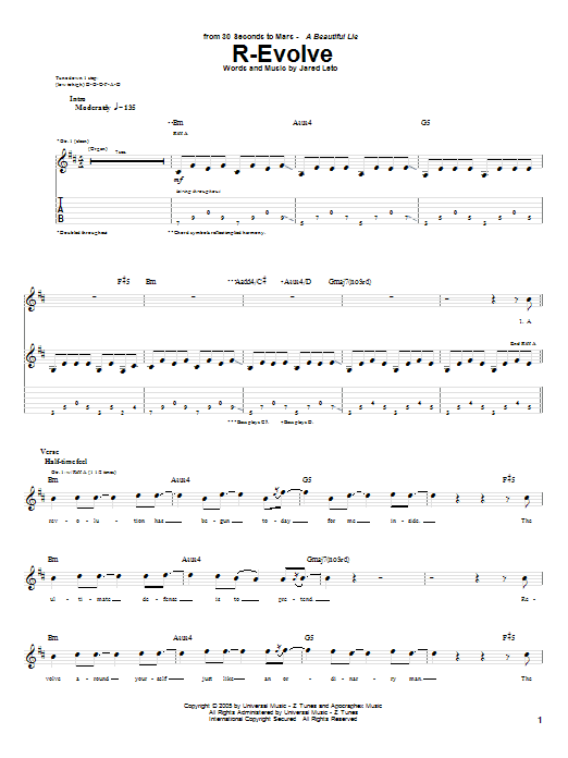 Download or print 30 Seconds To Mars R-Evolve sheet music, chords and digital score arranged for Guitar Tab. This Pop score includes 8 page(s).