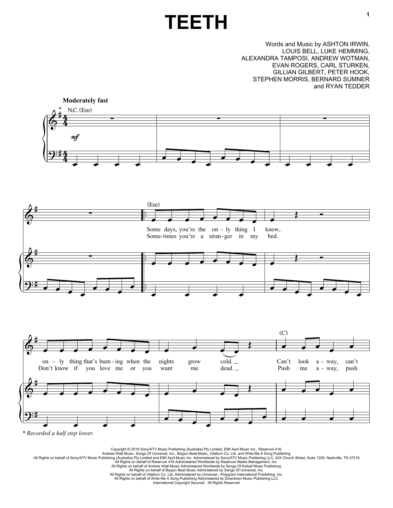 Download or print 5 Seconds of Summer Teeth sheet music, chords and digital score arranged for Piano, Vocal & Guitar Chords (Right-Hand Melody). This Pop score includes 7 page(s).
