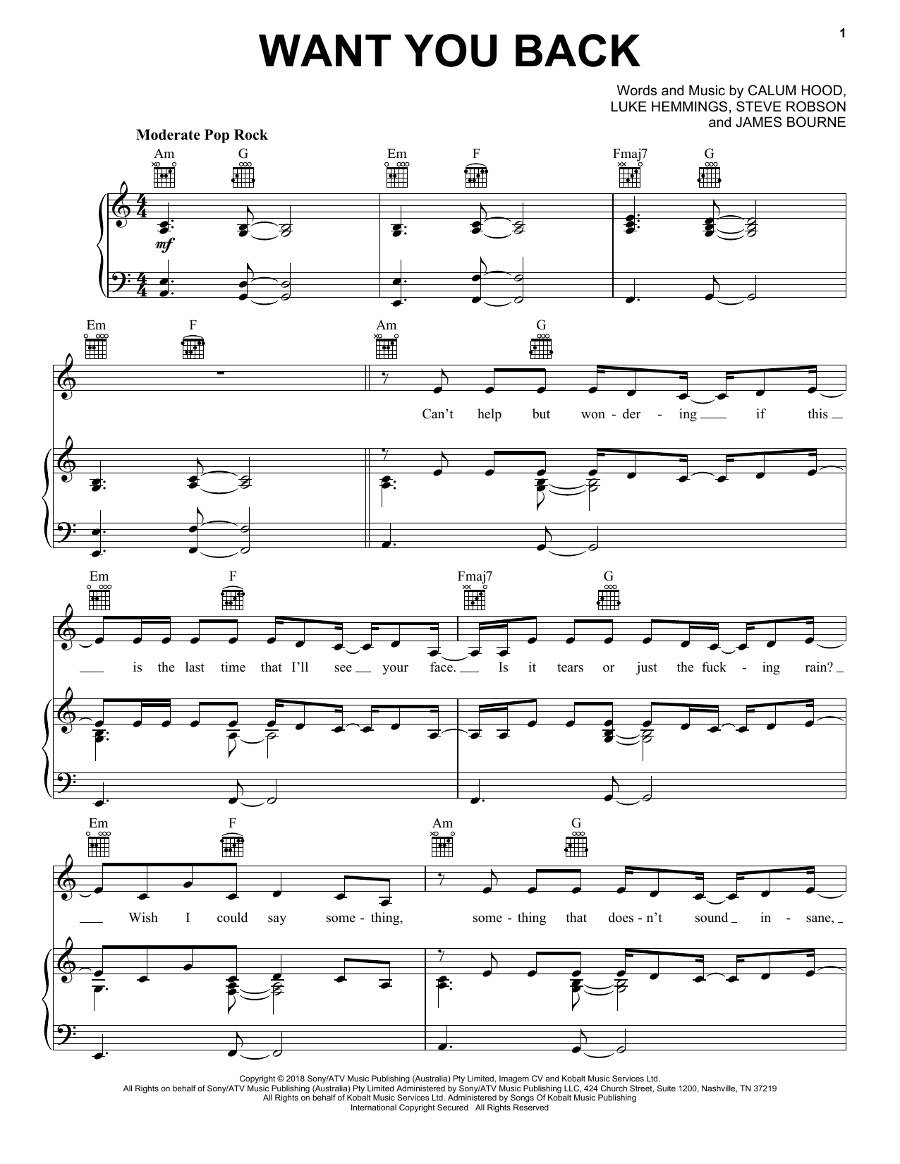 Download or print 5 Seconds of Summer Want You Back sheet music, chords and digital score arranged for Piano, Vocal & Guitar Chords (Right-Hand Melody). This Pop score includes 7 page(s).