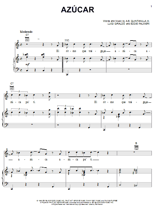 Download or print A.B. Quintanilla III Azucar sheet music, chords and digital score arranged for Piano, Vocal & Guitar Chords (Right-Hand Melody). This Latin score includes 7 page(s).
