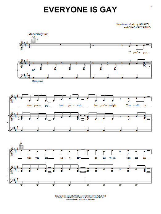 Download or print A Great Big World Everyone Is Gay sheet music, chords and digital score arranged for Piano, Vocal & Guitar Chords (Right-Hand Melody). This Pop score includes 5 page(s).