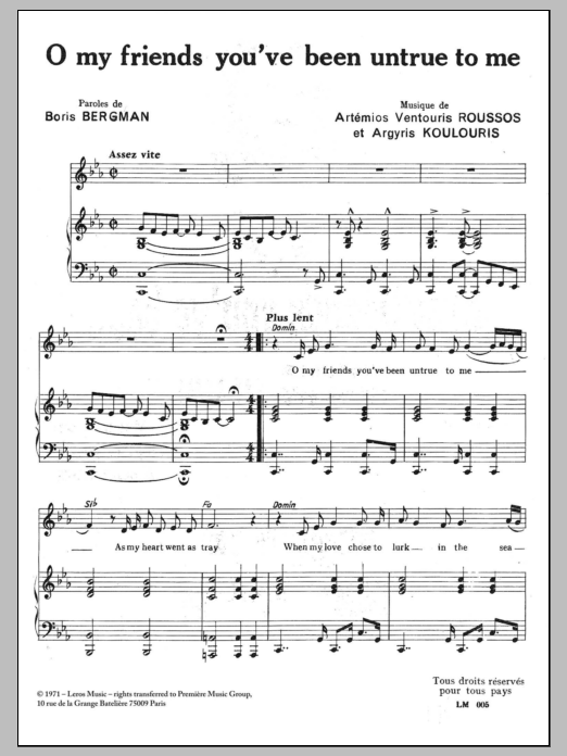 Download or print A Koulouris O My Friends You've Been Untrue To Me sheet music, chords and digital score arranged for Piano & Vocal. This Pop score includes 3 page(s).