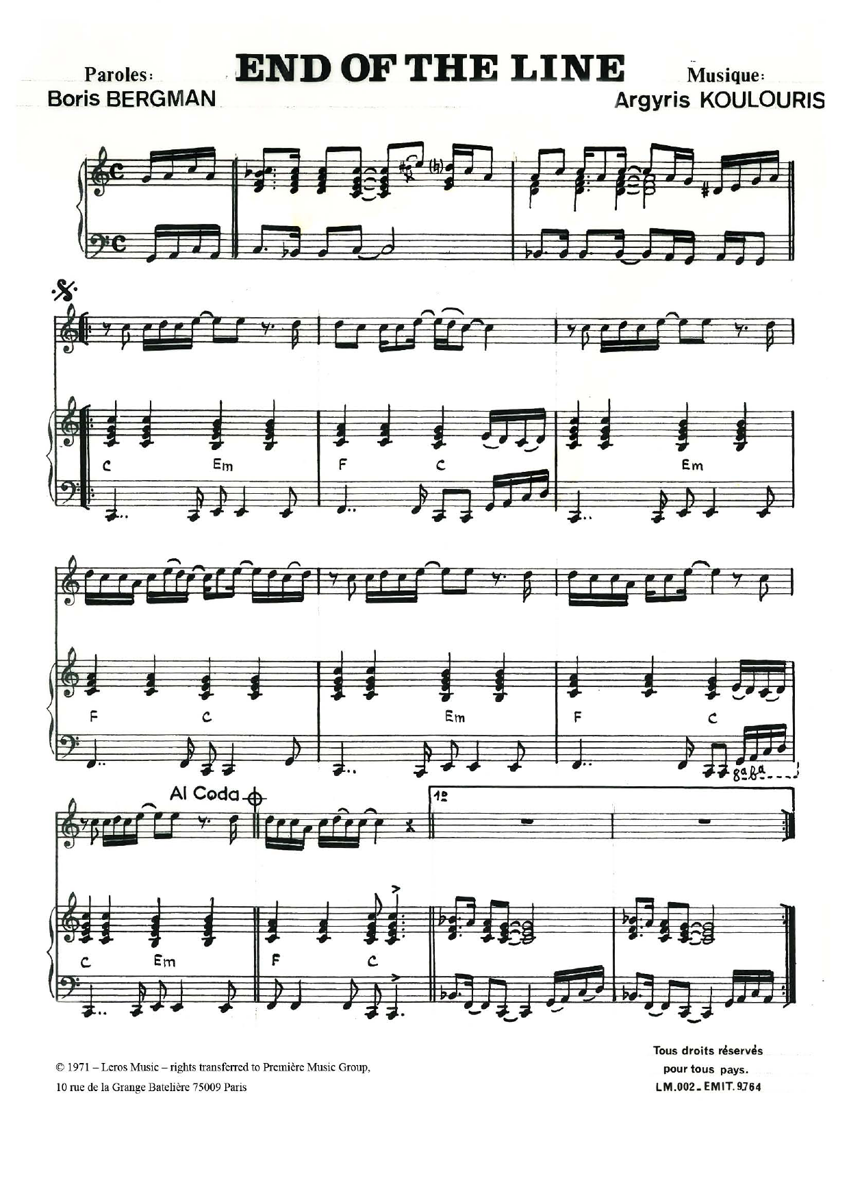 Download or print A Koulouris The End Of The Line sheet music, chords and digital score arranged for Piano & Vocal. This Standards score includes 3 page(s).