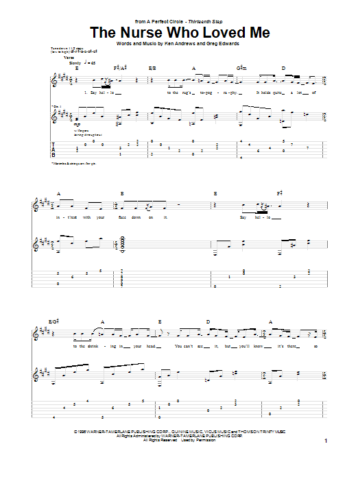 Download or print A Perfect Circle The Nurse Who Loved Me sheet music, chords and digital score arranged for Guitar Tab. This Pop score includes 5 page(s).