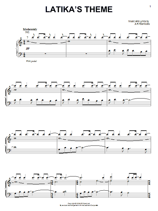 Download or print A.R. Rahman Latika's Theme sheet music, chords and digital score arranged for Piano, Vocal & Guitar Chords (Right-Hand Melody). This Film/TV score includes 4 page(s).