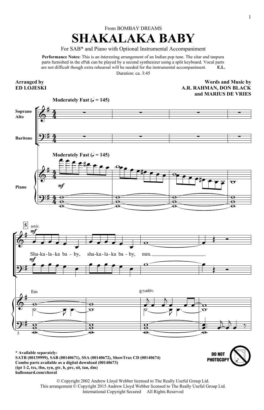 Download or print Ed Lojeski Shakalaka Baby (from Bombay Dreams) sheet music, chords and digital score arranged for SSA Choir. This Broadway score includes 10 page(s).