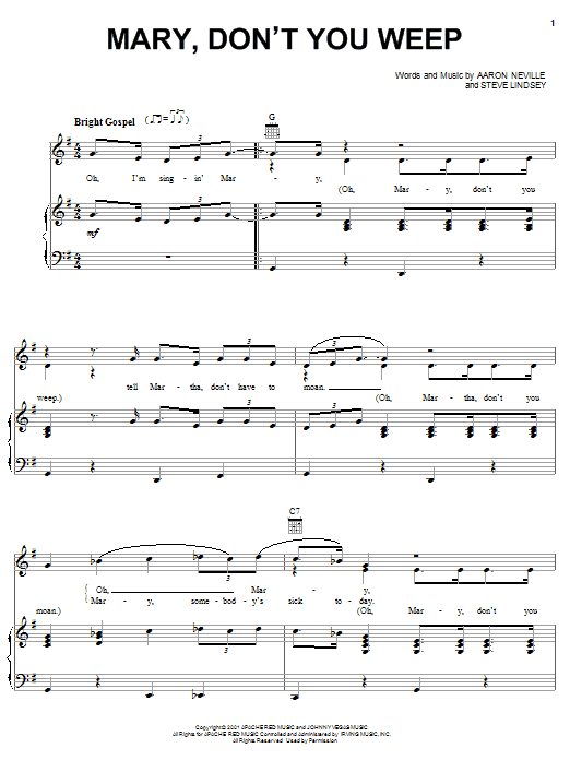 Download or print Aaron Neville Mary Don't You Weep sheet music, chords and digital score arranged for Piano, Vocal & Guitar Chords (Right-Hand Melody). This Inspirational score includes 4 page(s).