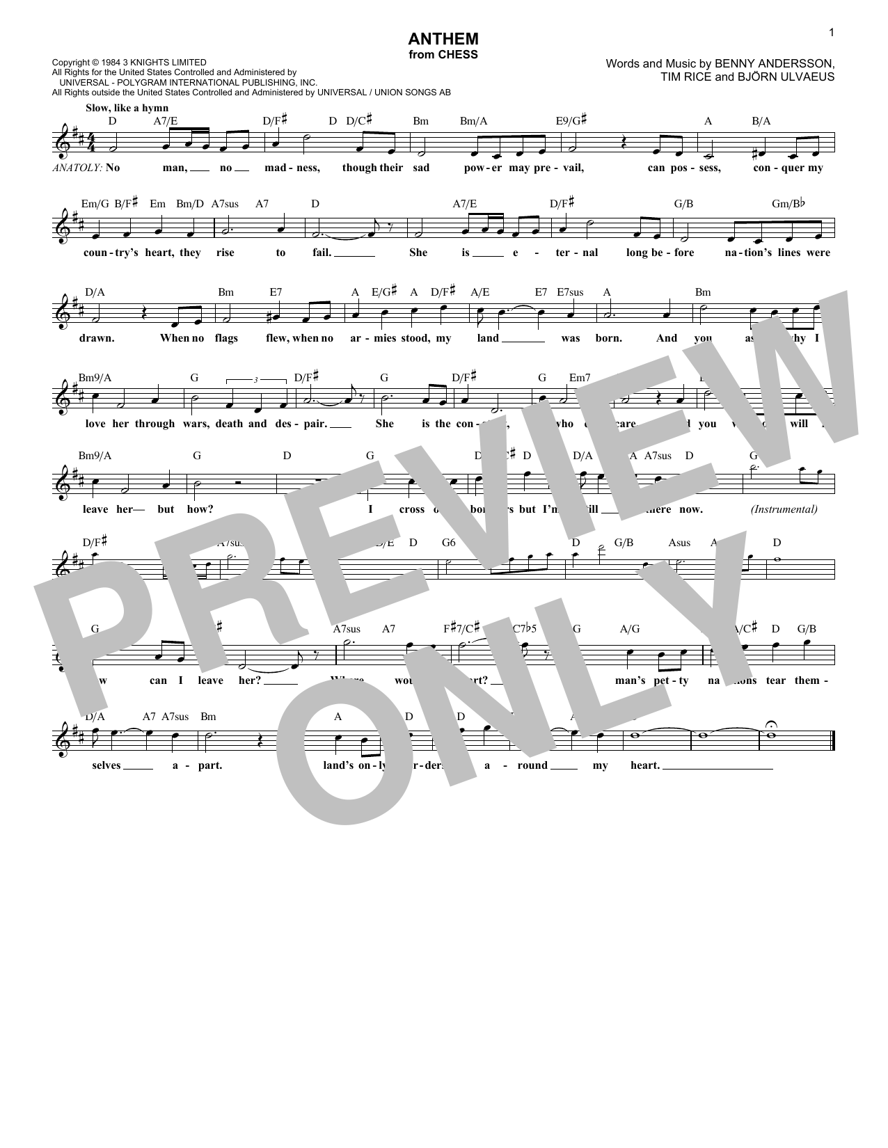 Download or print ABBA Anthem sheet music, chords and digital score arranged for Lead Sheet / Fake Book. This Pop score includes 1 page(s).