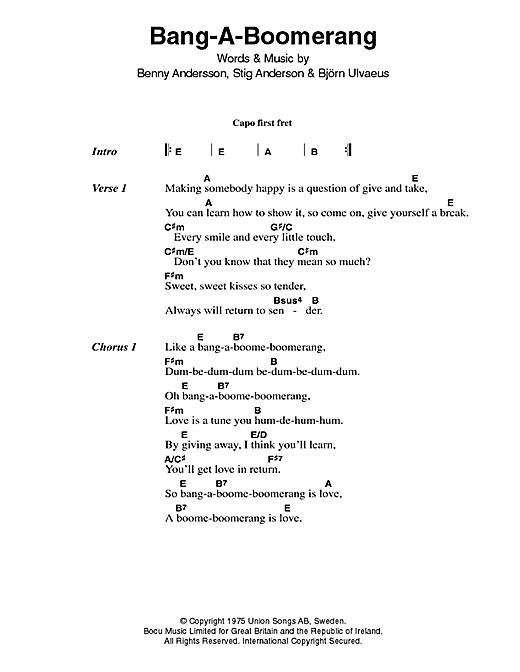 Download or print ABBA Bang-A-Boomerang sheet music, chords and digital score arranged for Guitar Chords/Lyrics. This Pop score includes 2 page(s).