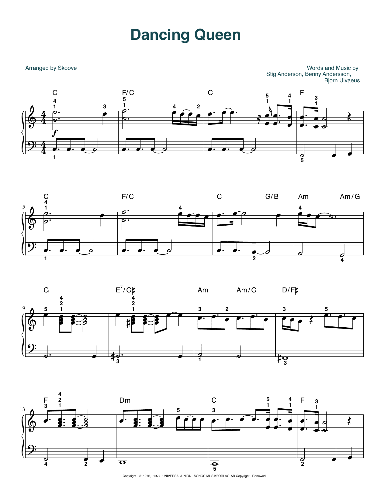 Download or print ABBA Dancing Queen (arr. Skoove) sheet music, chords and digital score arranged for Easy Piano. This Pop score includes 3 page(s).