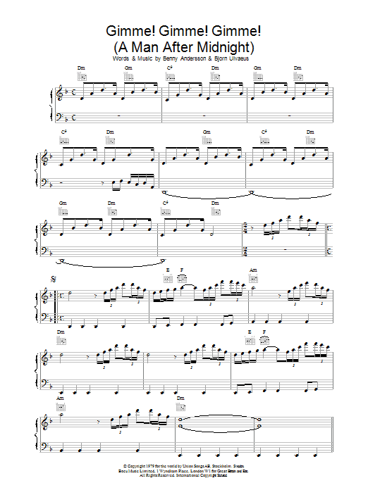 Download or print ABBA Gimme! Gimme! Gimme! (A Man After Midnight) sheet music, chords and digital score arranged for Piano, Vocal & Guitar Chords. This Pop score includes 4 page(s).