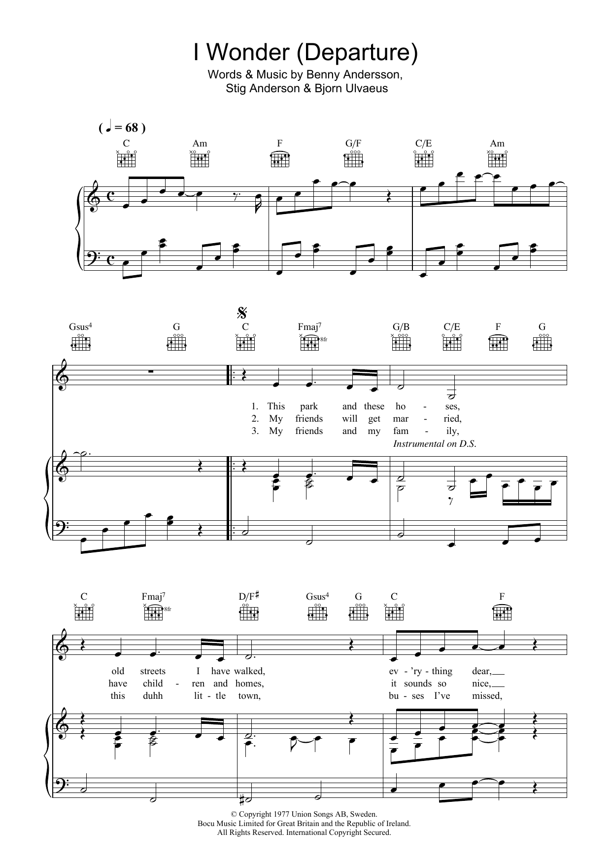Download or print ABBA I Wonder (Departure) sheet music, chords and digital score arranged for Piano, Vocal & Guitar Chords. This Pop score includes 4 page(s).