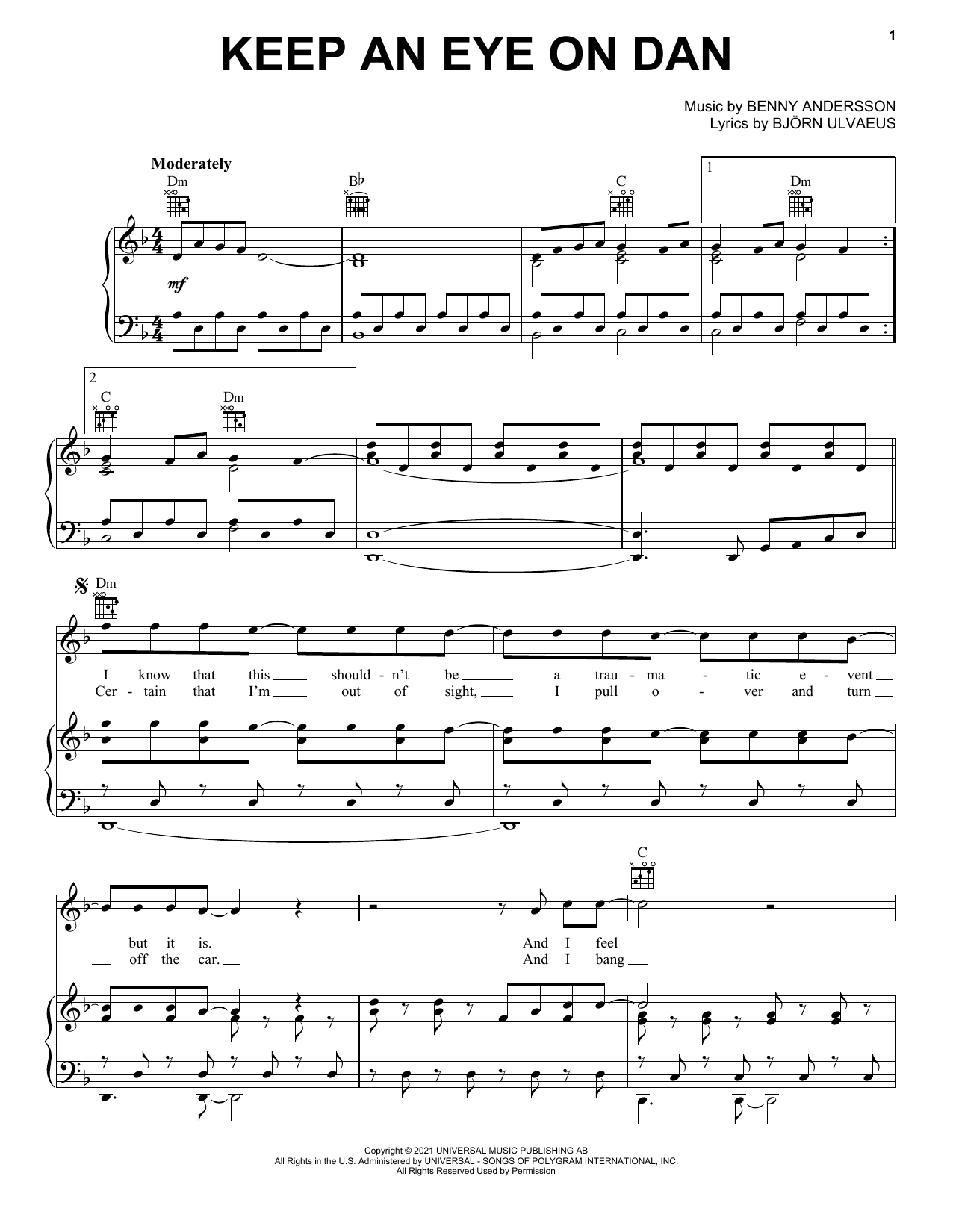 Download or print ABBA Keep An Eye On Dan sheet music, chords and digital score arranged for Piano, Vocal & Guitar Chords (Right-Hand Melody). This Pop score includes 6 page(s).