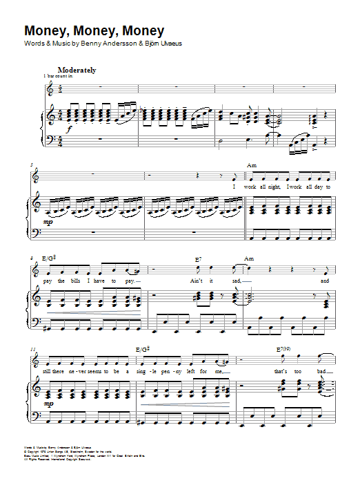 Download or print ABBA Money, Money, Money sheet music, chords and digital score arranged for Piano, Vocal & Guitar Chords (Right-Hand Melody). This Film/TV score includes 8 page(s).