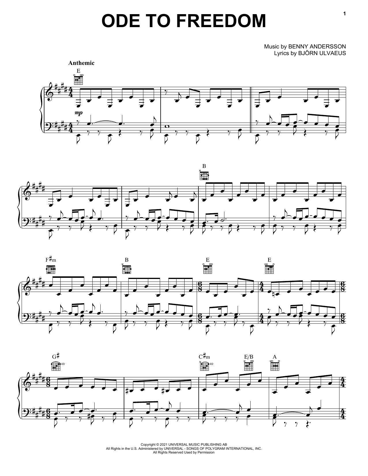 Download or print ABBA Ode To Freedom sheet music, chords and digital score arranged for Piano, Vocal & Guitar Chords (Right-Hand Melody). This Pop score includes 4 page(s).