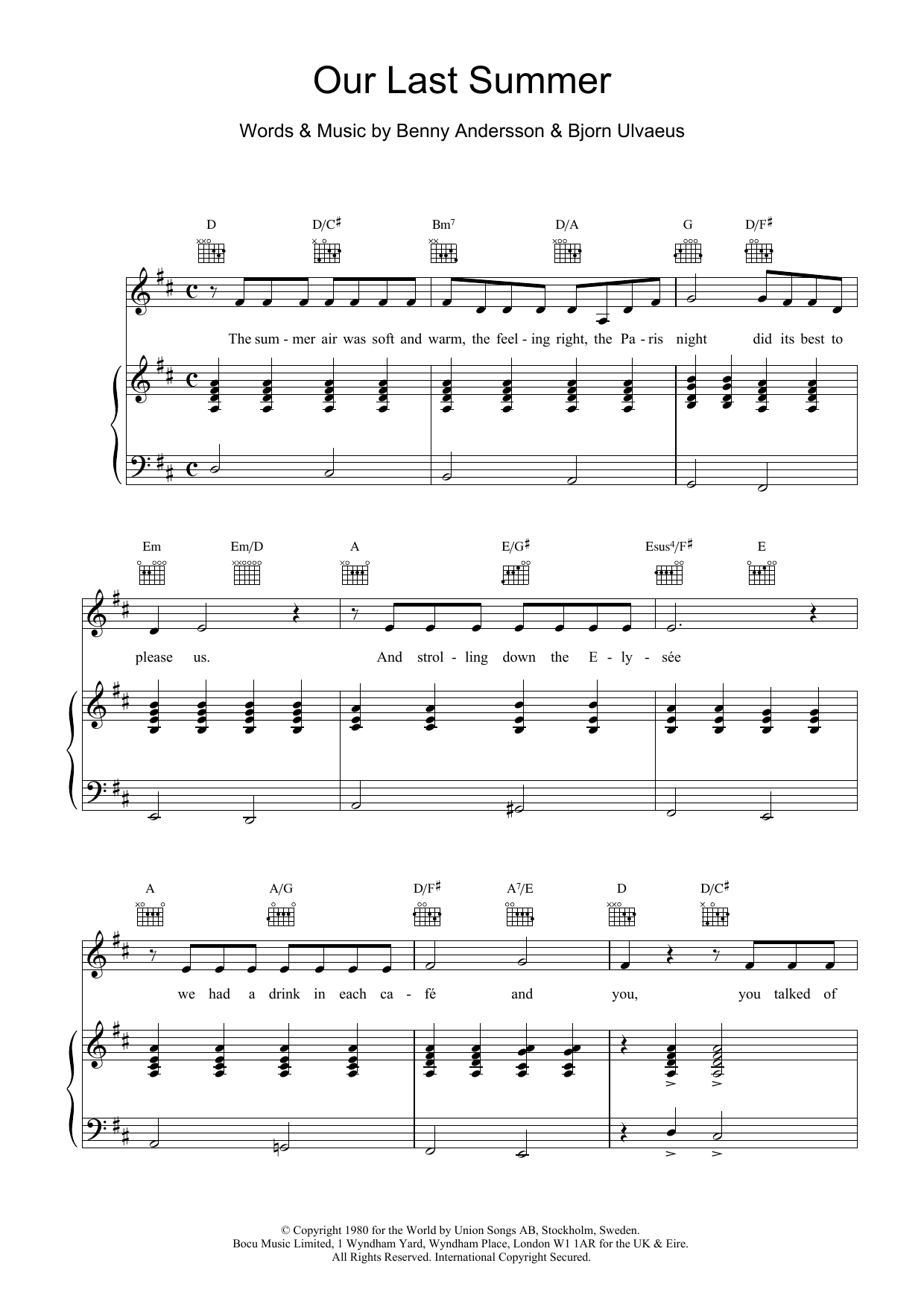 Download or print ABBA Our Last Summer sheet music, chords and digital score arranged for Really Easy Piano. This Pop score includes 2 page(s).