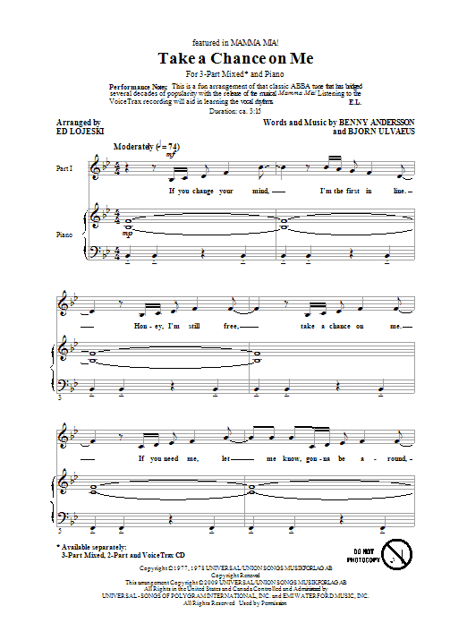 Download or print Ed Lojeski Take A Chance On Me sheet music, chords and digital score arranged for 3-Part Mixed Choir. This Disco score includes 14 page(s).