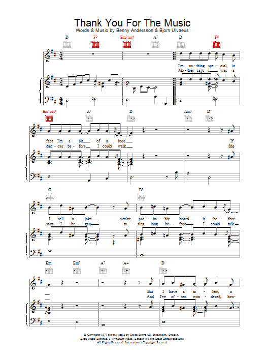 Download or print ABBA Thank You For The Music sheet music, chords and digital score arranged for Easy Piano. This Pop score includes 2 page(s).