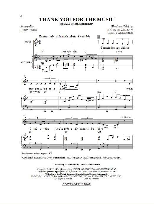 Quick facts Thank You For The Music (arr. Jerry Estes) about digital sheet music