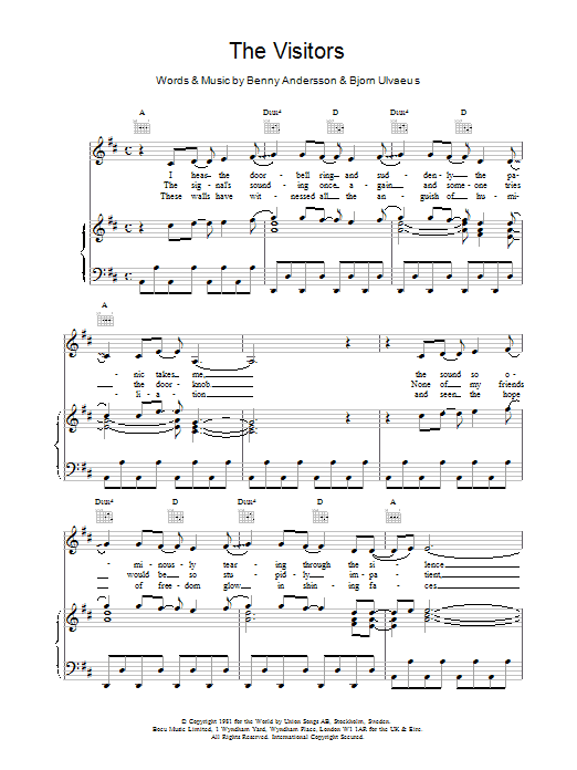 Download or print ABBA The Visitors sheet music, chords and digital score arranged for Really Easy Piano. This Pop score includes 3 page(s).