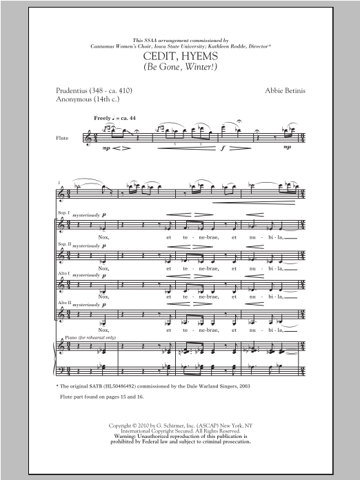 Download or print Abbie Betinis Cedit, Hyems (Be Gone, Winter!) sheet music, chords and digital score arranged for SSA Choir. This Concert score includes 14 page(s).