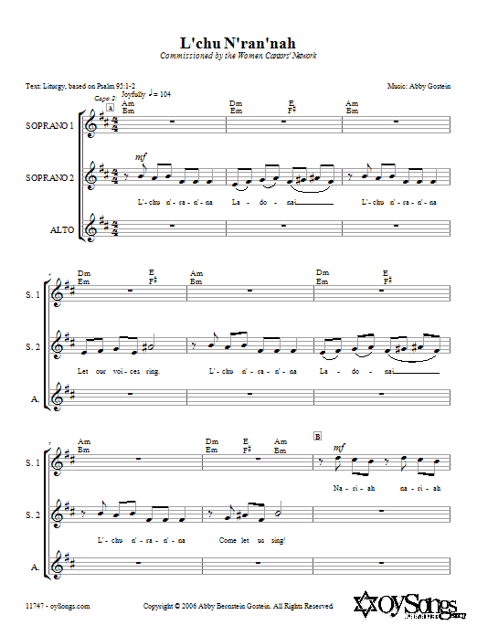 Download or print Abby Gostein L'chu N'ran'nah sheet music, chords and digital score arranged for SSA Choir. This Traditional score includes 6 page(s).