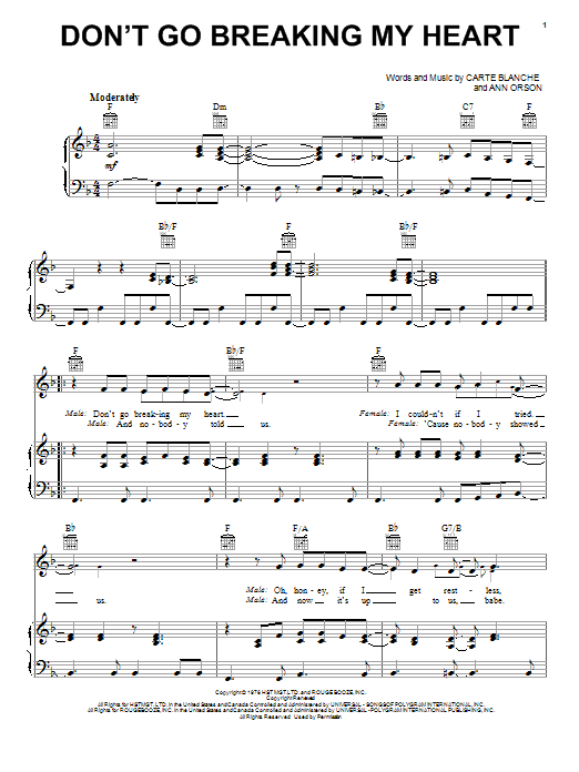 Download or print Abby Mallard Don't Go Breaking My Heart sheet music, chords and digital score arranged for Piano, Vocal & Guitar Chords (Right-Hand Melody). This Pop score includes 5 page(s).