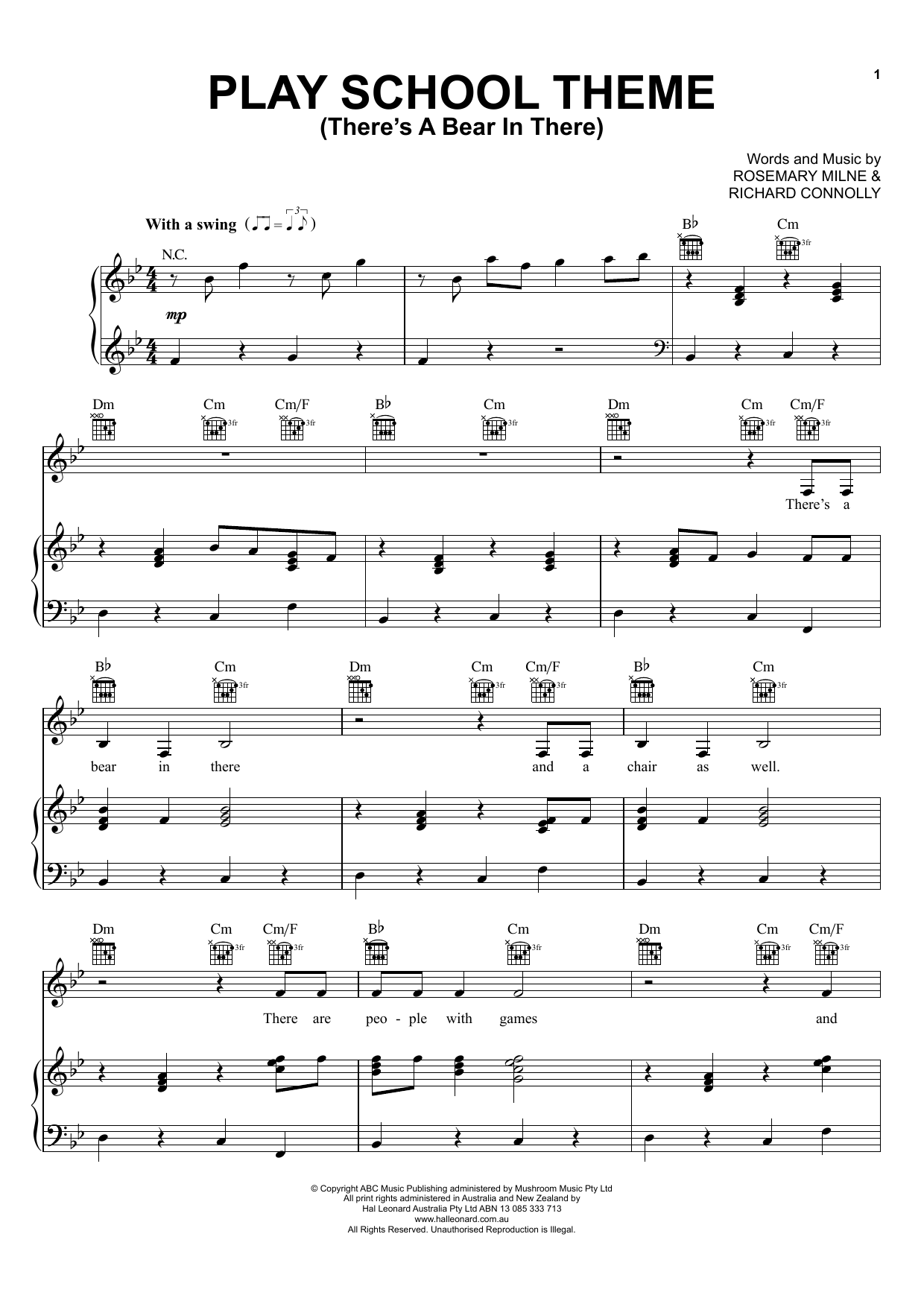 Download or print ABC Australia Play School Play School Theme (There's a Bear in There) sheet music, chords and digital score arranged for Piano, Vocal & Guitar Chords (Right-Hand Melody). This Children score includes 2 page(s).