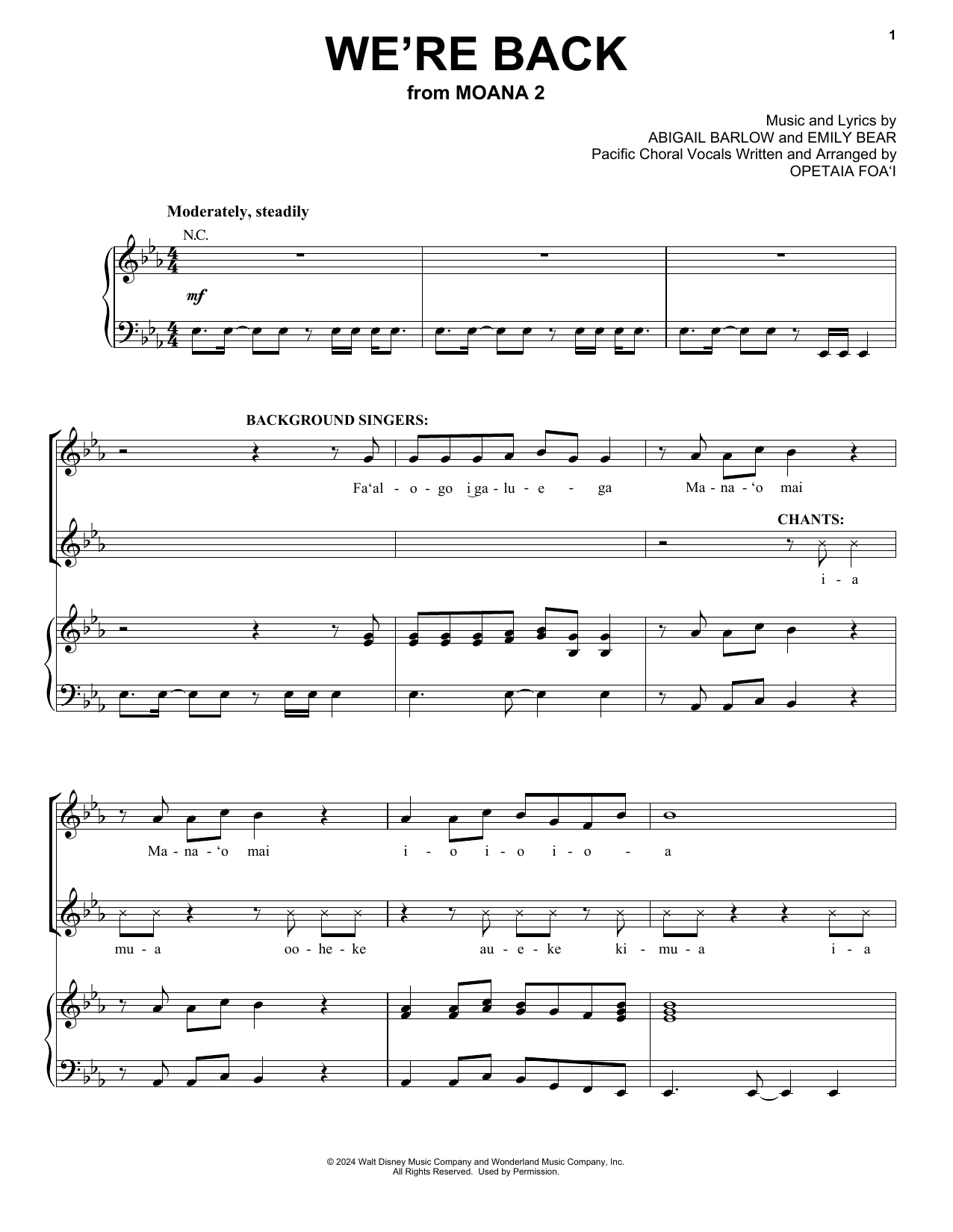 Download or print Abigail Barlow, Emily Bear & Opetaia Foa'i We're Back (from Moana 2) sheet music, chords and digital score arranged for Piano, Vocal & Guitar Chords (Right-Hand Melody). This Disney score includes 12 page(s).