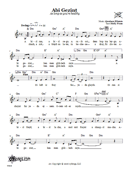 Download or print Abraham Ellstein Abi Gezint (As Long As You're Healthy) sheet music, chords and digital score arranged for Lead Sheet / Fake Book. This Traditional score includes 2 page(s).