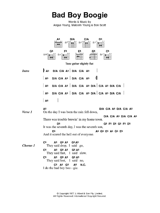 Download or print AC/DC Bad Boy Boogie sheet music, chords and digital score arranged for Guitar Chords/Lyrics. This Rock score includes 3 page(s).