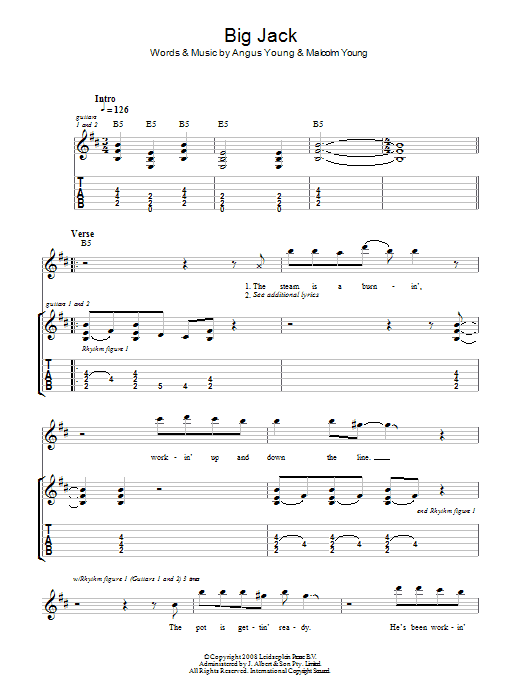 Download or print AC/DC Big Jack sheet music, chords and digital score arranged for Guitar Tab. This Metal score includes 9 page(s).