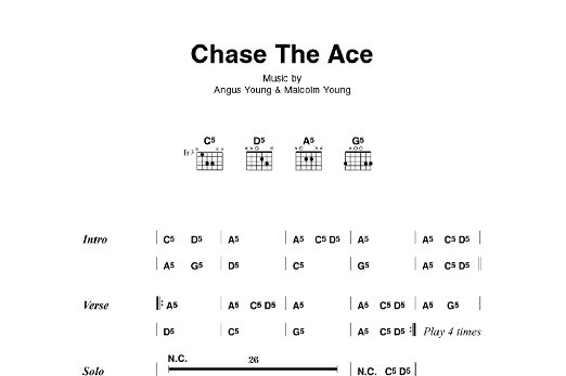 Download or print AC/DC Chase The Ace sheet music, chords and digital score arranged for Guitar Chords/Lyrics. This Rock score includes 2 page(s).
