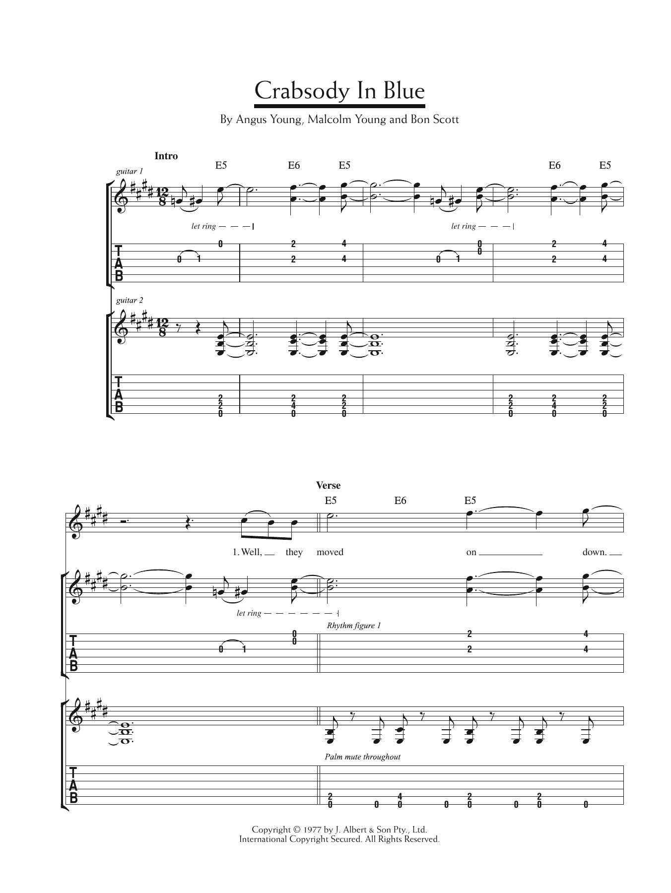 Download or print AC/DC Crabsody In Blue sheet music, chords and digital score arranged for Guitar Tab. This Rock score includes 17 page(s).
