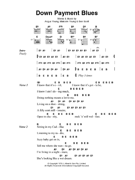 Download or print AC/DC Down Payment Blues sheet music, chords and digital score arranged for Guitar Chords/Lyrics. This Rock score includes 3 page(s).