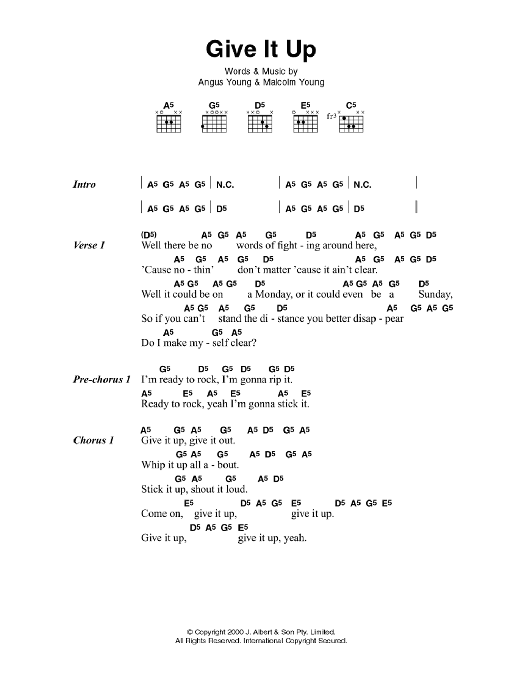 Download or print AC/DC Give It Up sheet music, chords and digital score arranged for Guitar Chords/Lyrics. This Rock score includes 3 page(s).