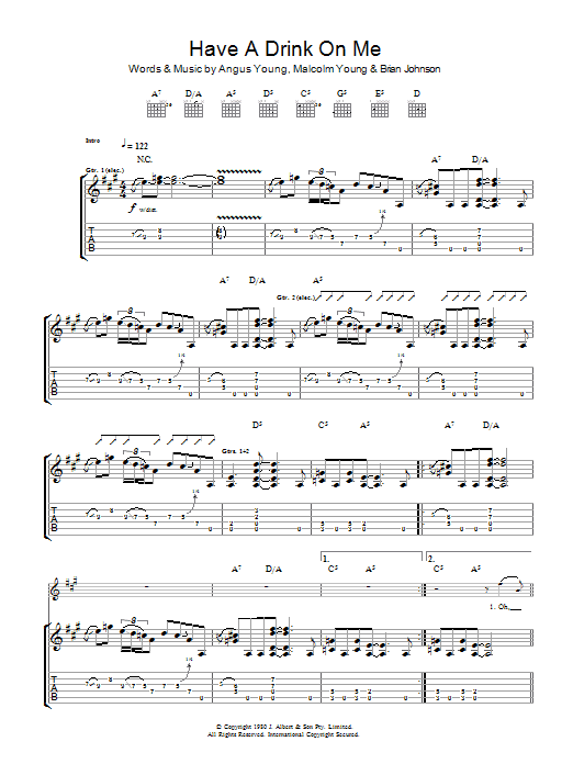 Download or print AC/DC Have A Drink On Me sheet music, chords and digital score arranged for Piano, Vocal & Guitar Chords (Right-Hand Melody). This Metal score includes 7 page(s).
