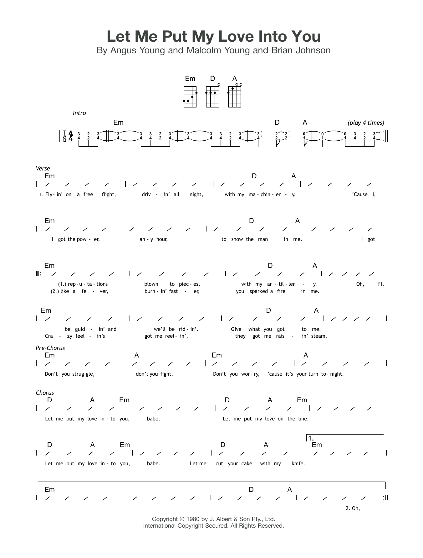 Download or print AC/DC Let Me Put My Love Into You sheet music, chords and digital score arranged for Guitar Chords/Lyrics. This Rock score includes 2 page(s).