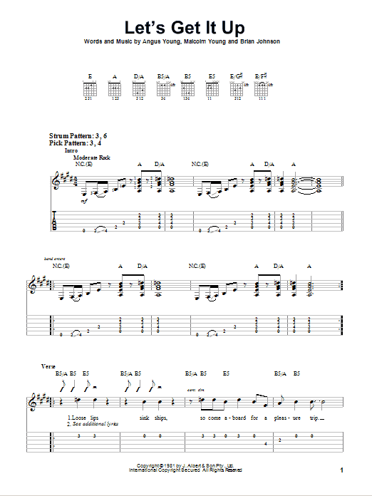 Download or print AC/DC Let's Get It Up sheet music, chords and digital score arranged for Guitar Chords/Lyrics. This Rock score includes 2 page(s).