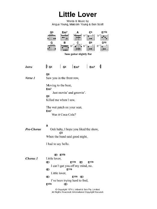 Download or print AC/DC Little Lover sheet music, chords and digital score arranged for Guitar Chords/Lyrics. This Rock score includes 3 page(s).