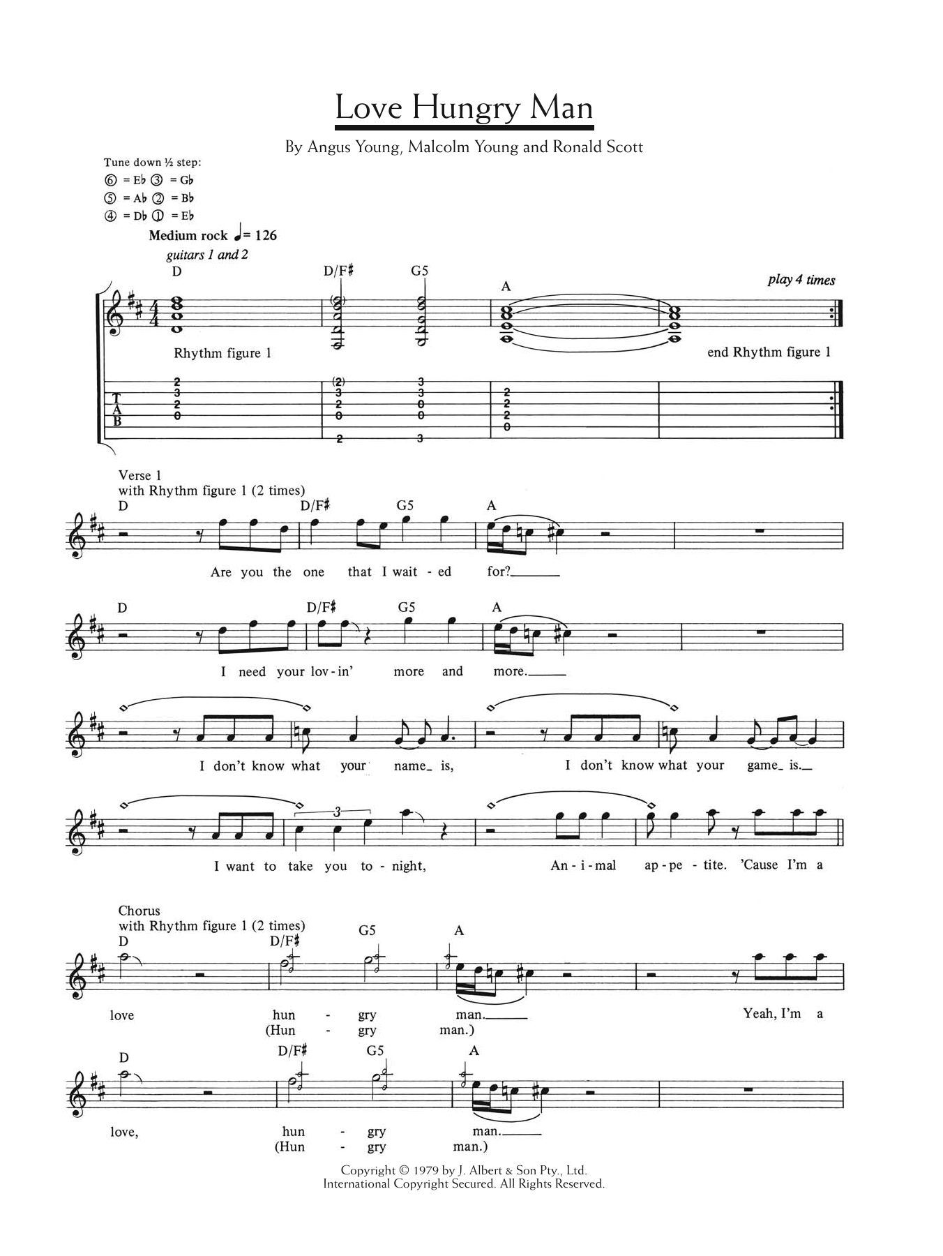 Download or print AC/DC Love Hungry Man sheet music, chords and digital score arranged for Guitar Chords/Lyrics. This Rock score includes 2 page(s).