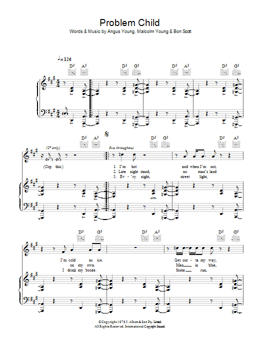 Download or print AC/DC Problem Child sheet music, chords and digital score arranged for Guitar Chords/Lyrics. This Rock score includes 3 page(s).