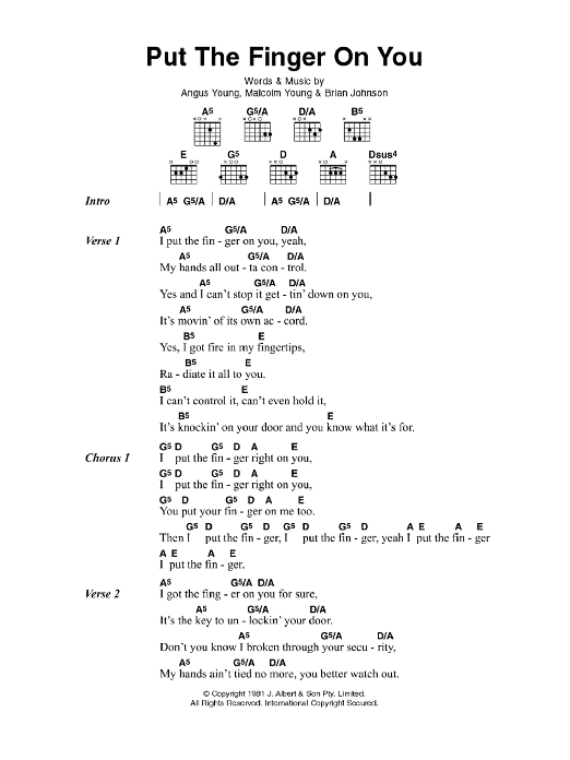 Download or print AC/DC Put The Finger On You sheet music, chords and digital score arranged for Guitar Chords/Lyrics. This Rock score includes 2 page(s).