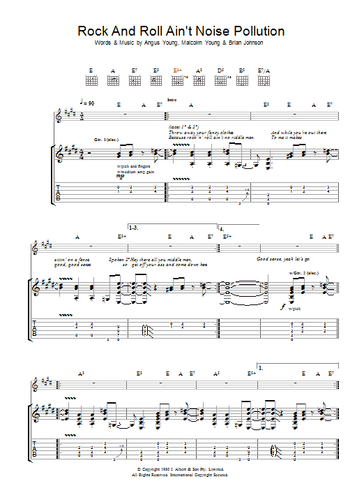 Download or print AC/DC Rock And Roll Ain't Noise Pollution sheet music, chords and digital score arranged for Ukulele Chords/Lyrics. This Rock score includes 2 page(s).